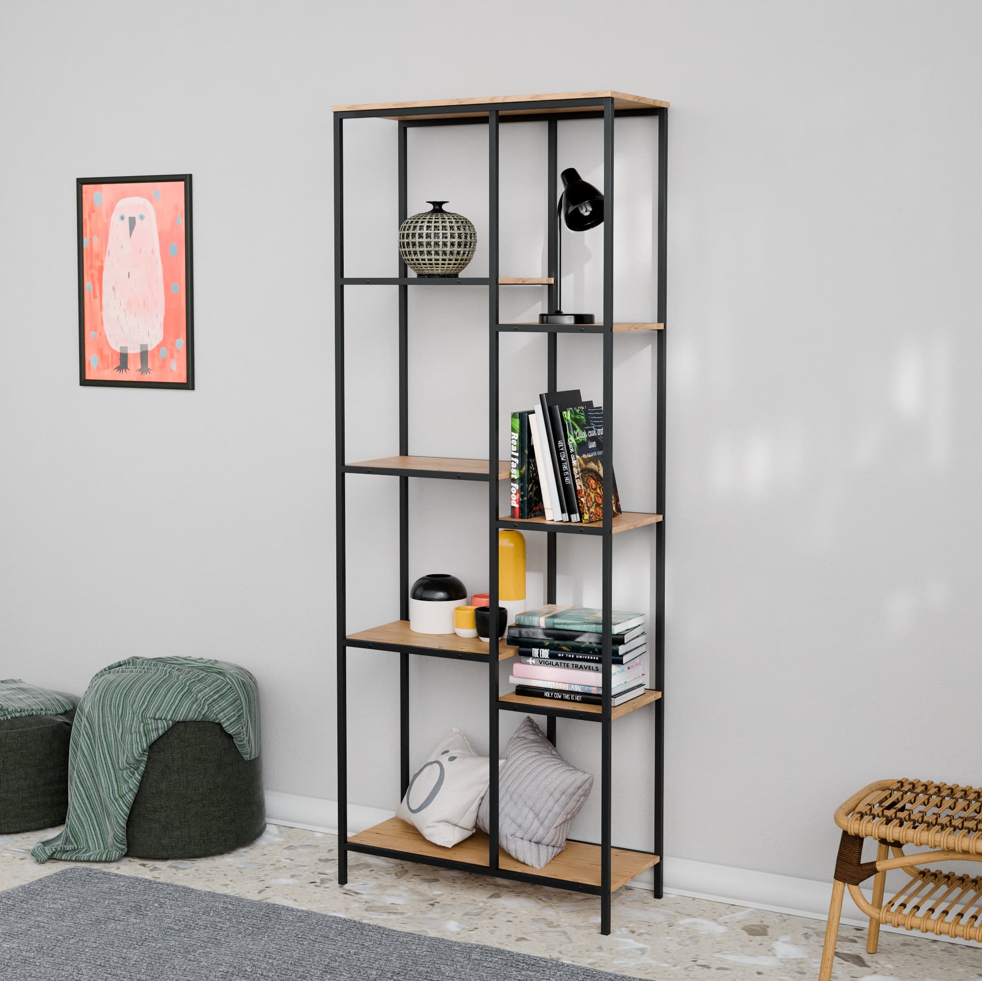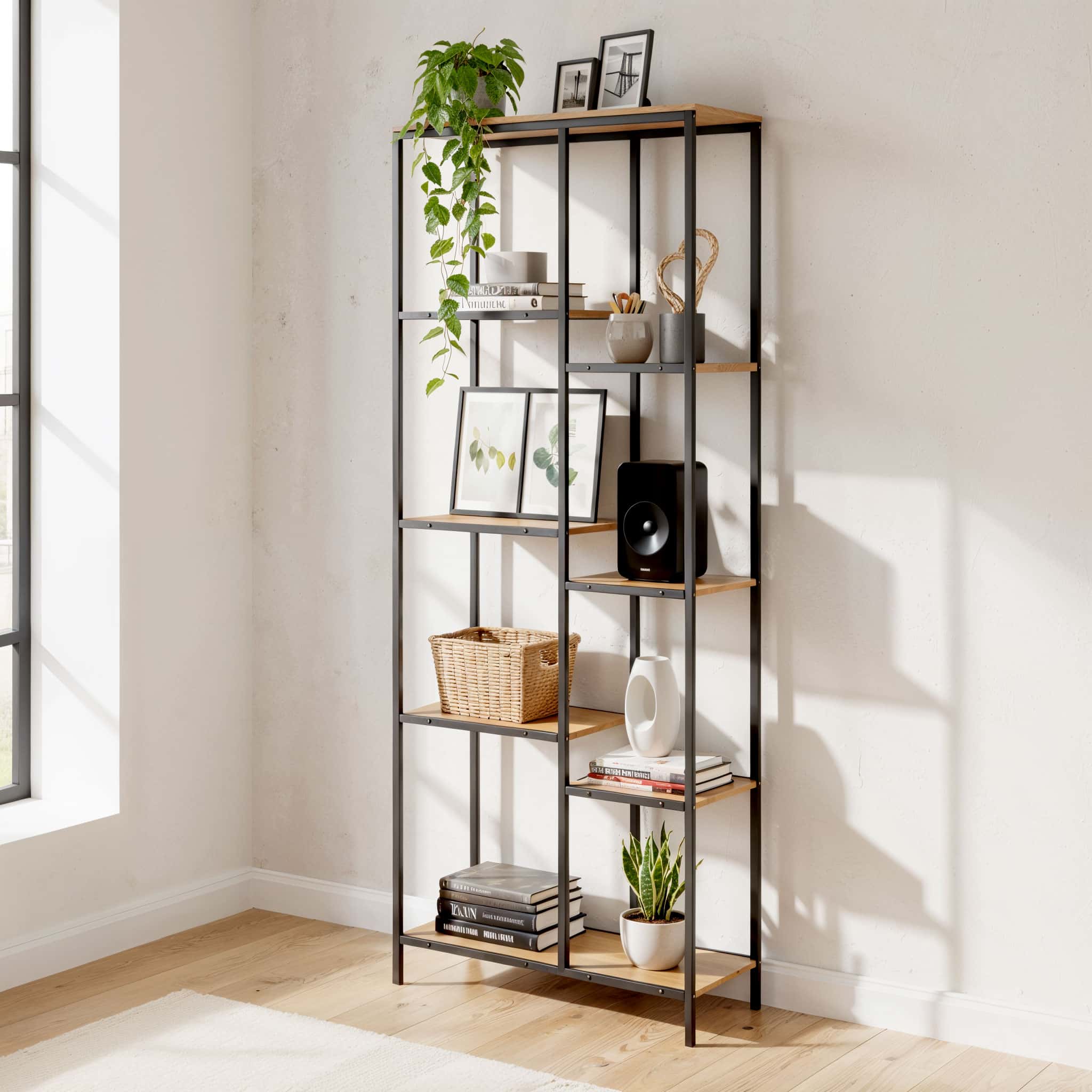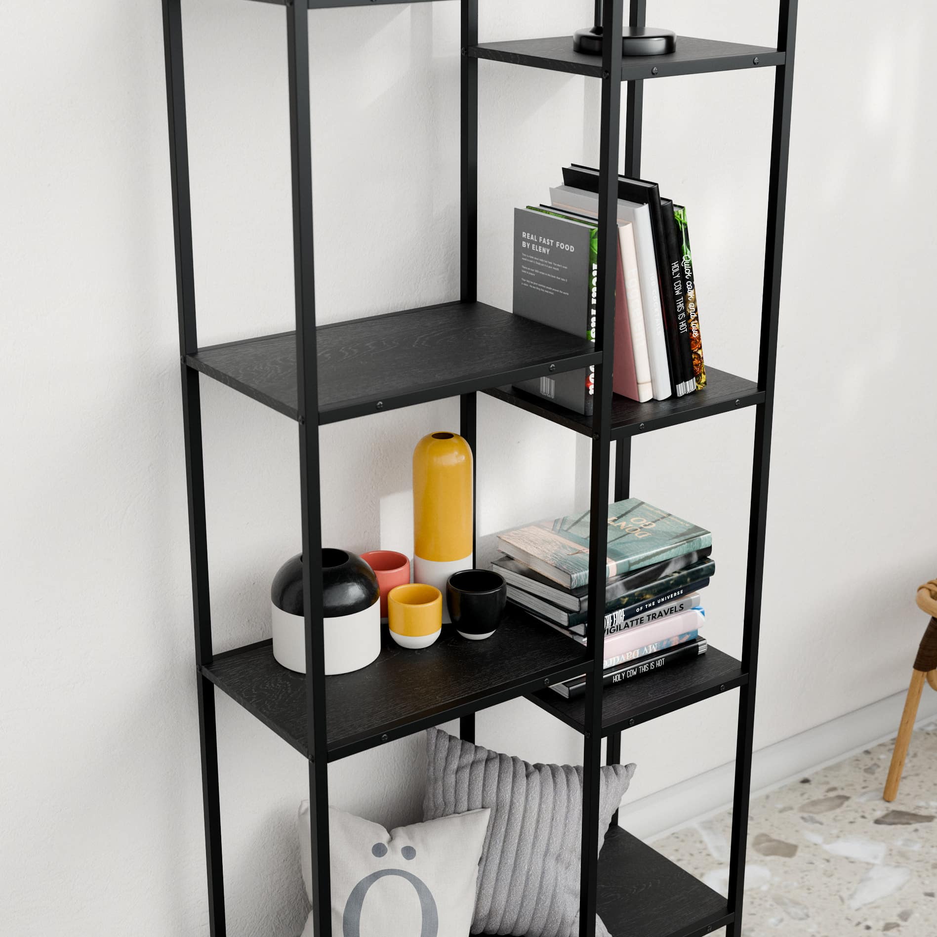 הספרייה בנויה ממתכת חזקה ומדפים רחבים ונוחים המאפשרים לשלב ספרים פריטי נוי תאורה ואביזרים אישיים בצורה אסתטית ומסודרת
