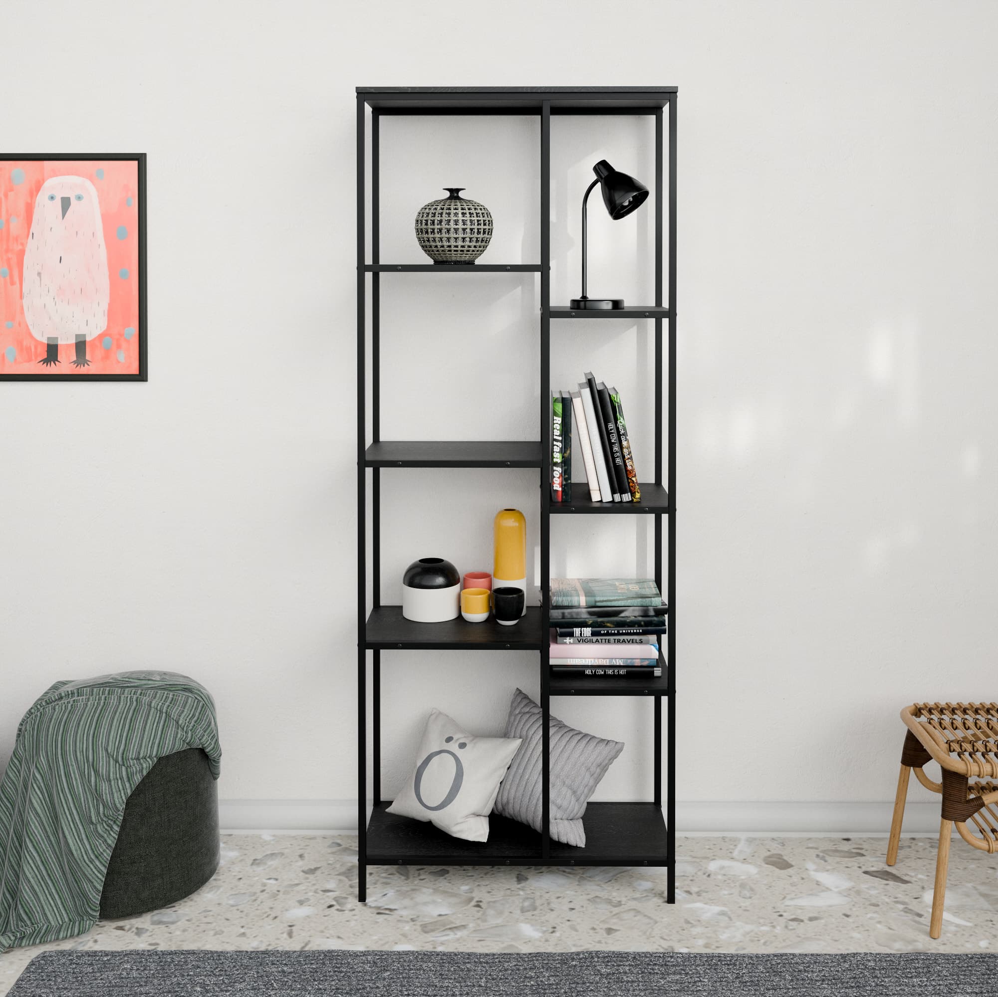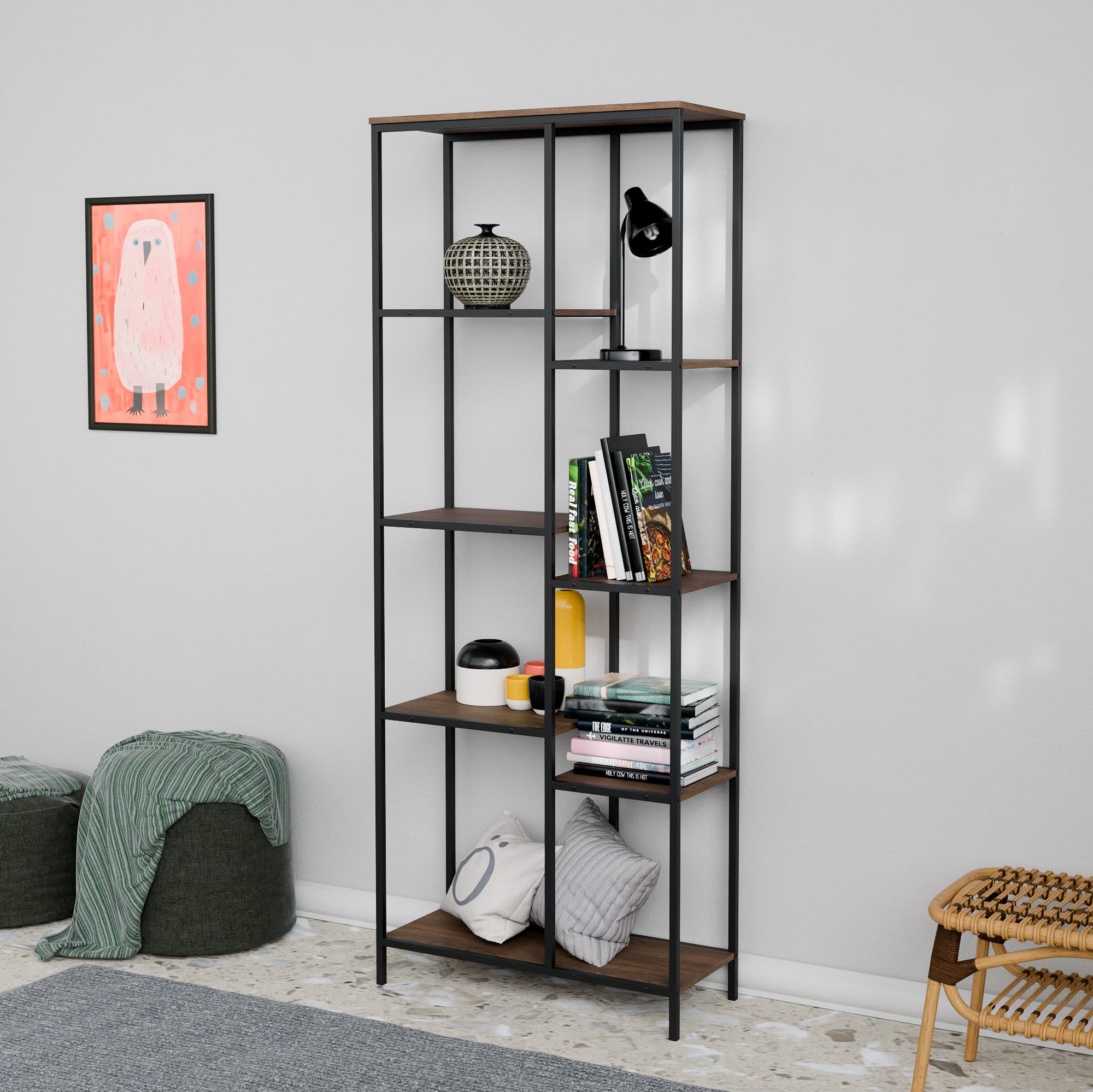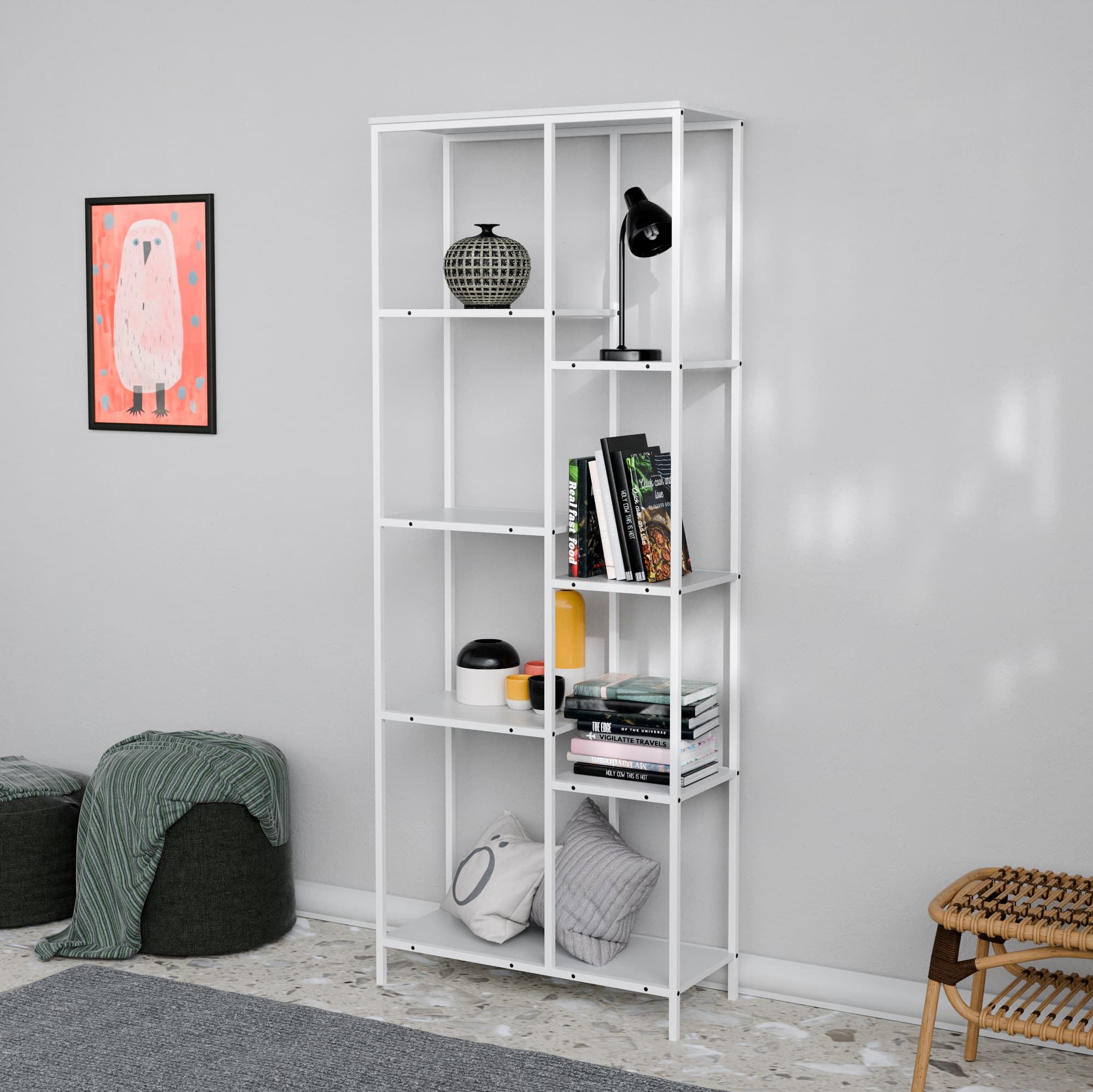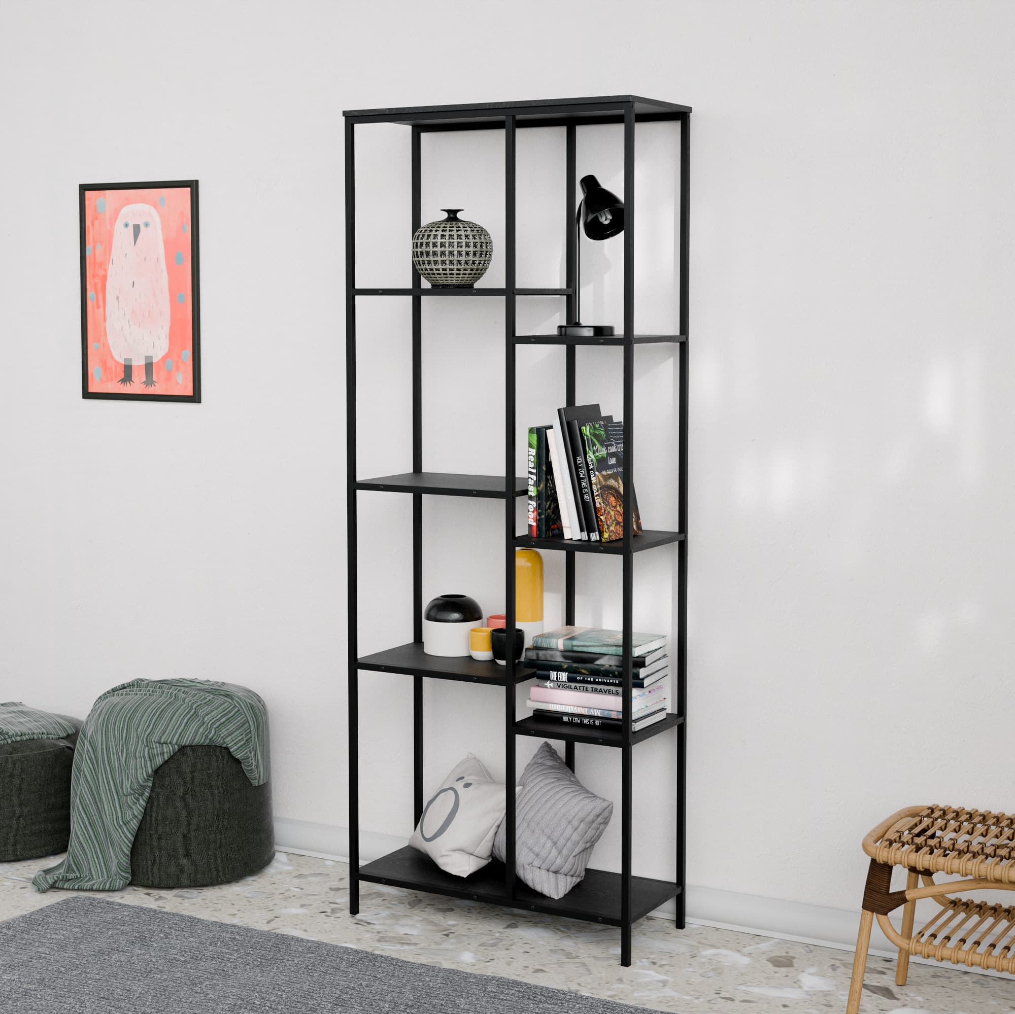 הספרייה בנויה ממתכת חזקה ומדפים רחבים ונוחים המאפשרים לשלב ספרים פריטי נוי תאורה ואביזרים אישיים בצורה אסתטית ומסודרת