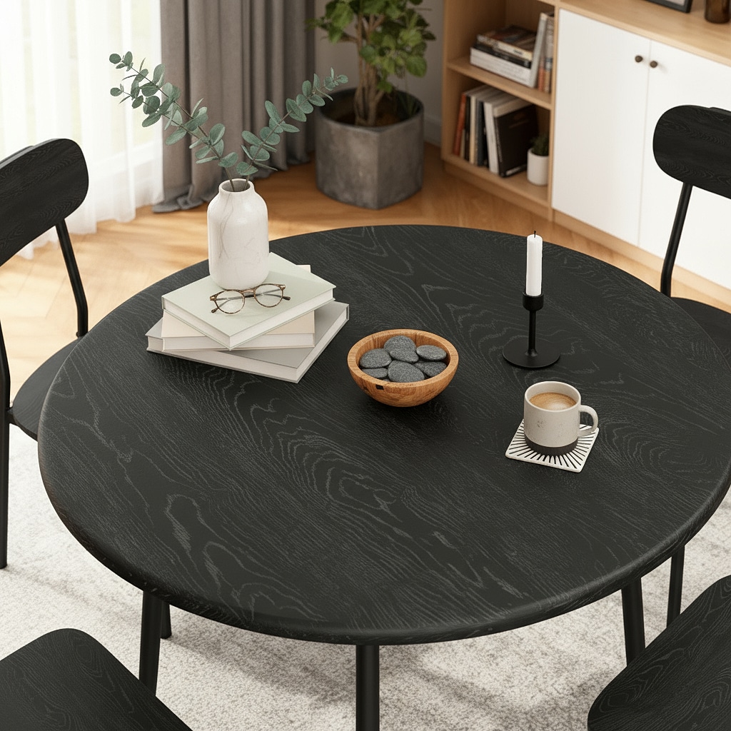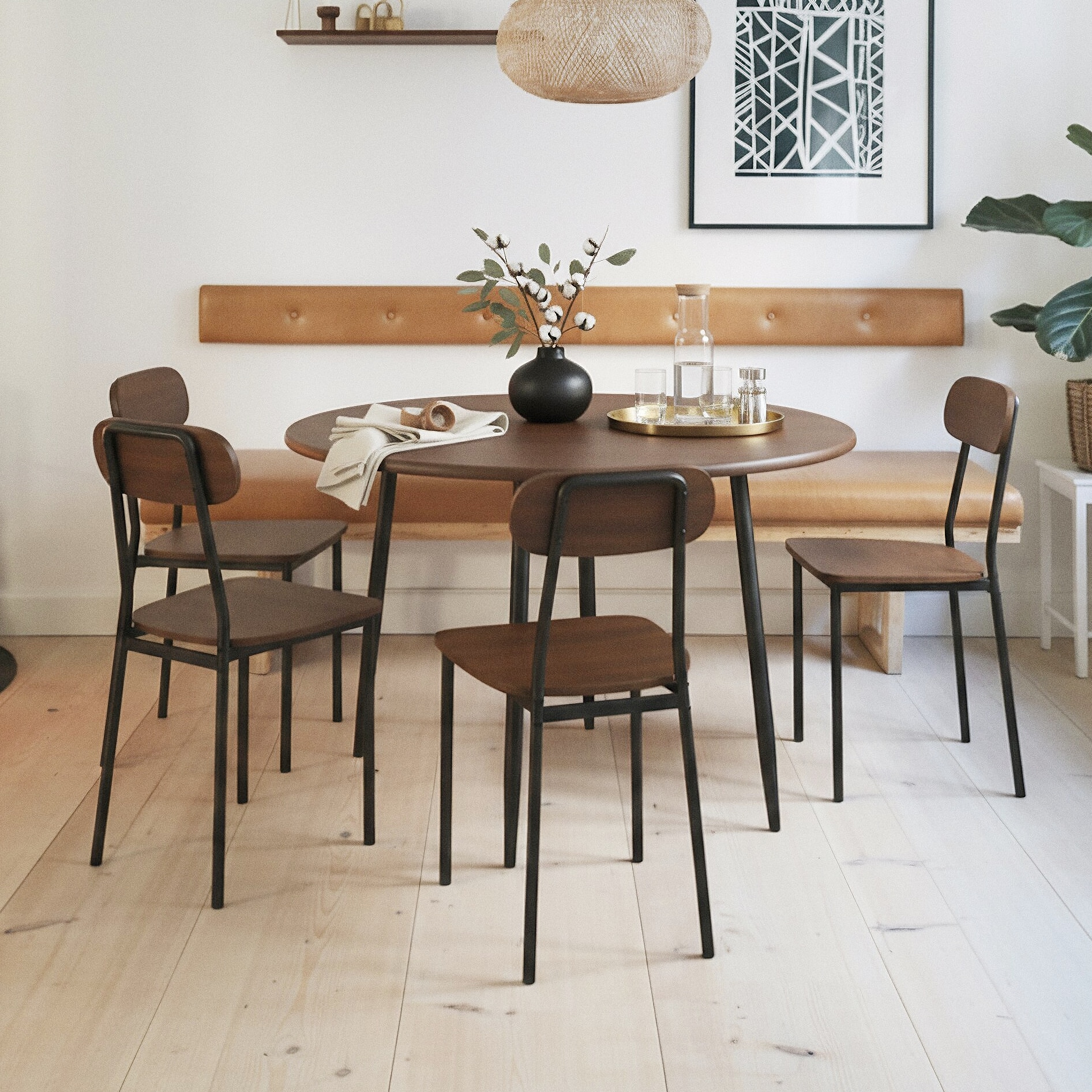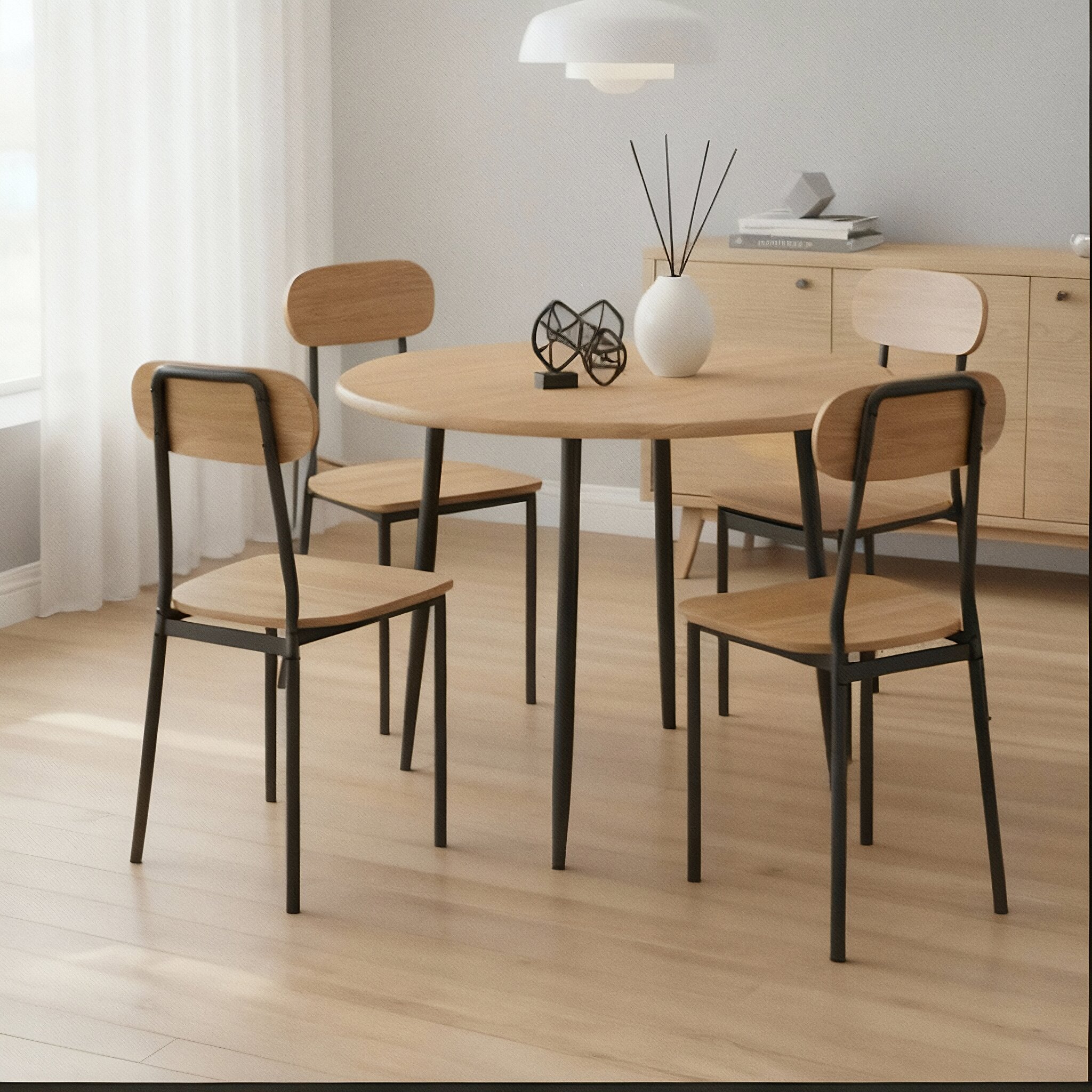 פינת אוכל במראה עץ בעלת ארבע רגלי מתכת מושחרת וכסאות תואמים