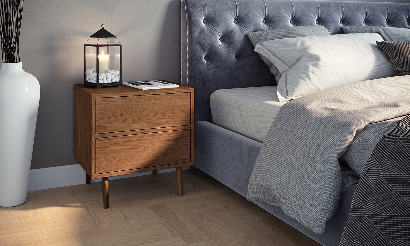 שידת לילה בעלת שתי מגירות על מסילה בפתיחה נסתרת ואיכותית ובעלת רגלי עץ יציבות